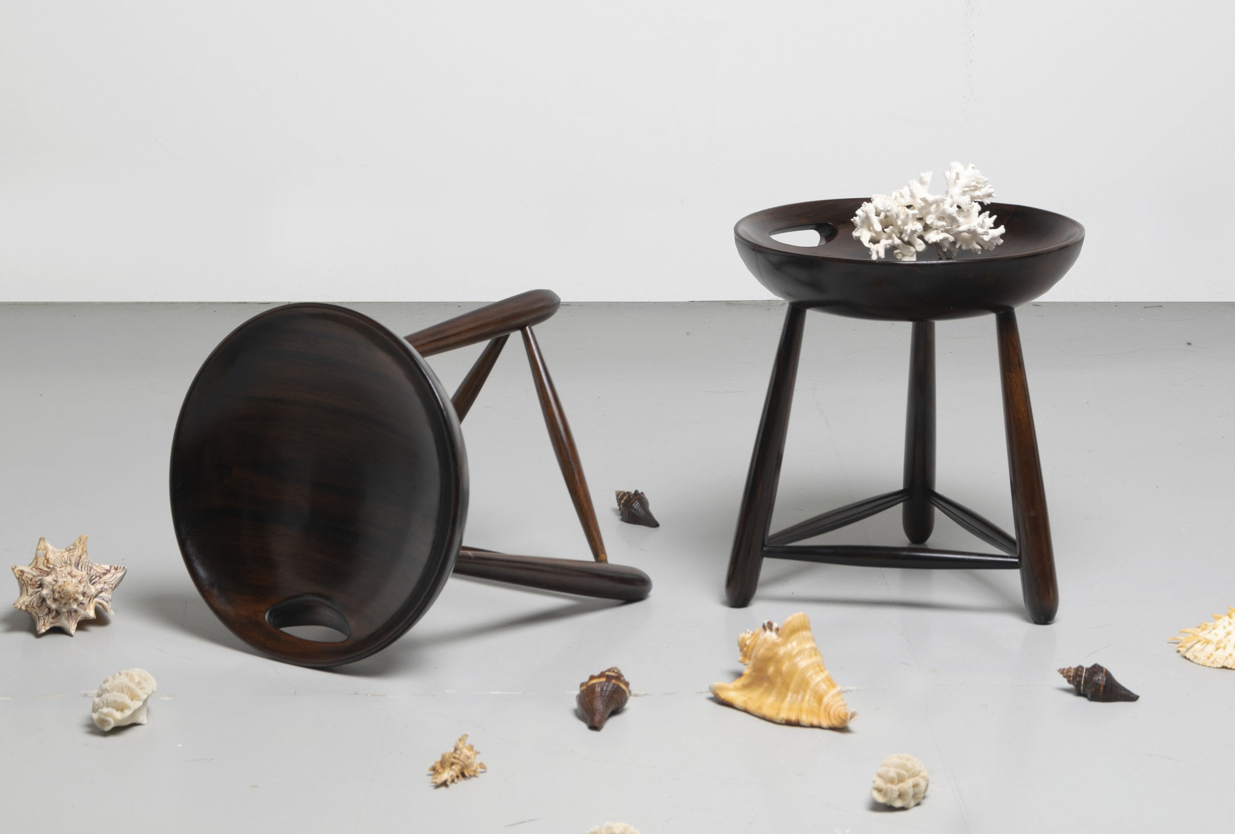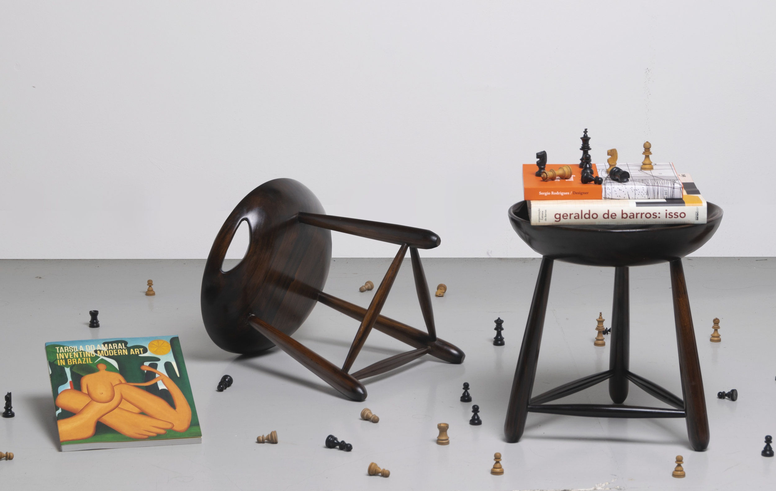 — SERGIO RODRIGUESSeats such as that of the chair Lucio Costa, the stool Mocho, and the armchair Mole, for example, suggest brazilianness [1] , speaking to signs of the national culture which are part of the founding myths of Brazil. As actors in a scenario that is filled with stories, they fit into a system of objects that exist for the living place, standing among the ‘household gods’ [2] who, for being personified, reached some autonomy in the 20 th century. Those who acquire these objects celebrate the fetish aura that surrounds them. The stool Mocho was the first seat produced and commercialized by Oca, in 1954. Not by accident, it was created in a time when identity issues were being discussed around the country. Sergio dives into the culture and rediscovers Brazil, giving identity to furniture and valuing the space around it. He also creates connections with the pieces’ past, local habits, and solutions that are already known to and part of society. The Mocho’s curves are carved in wood, and, as a sculpture, it is all about volume and mass.